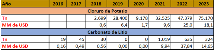 EXPORTACIÓN DE CLORURO DE POTASIO Y CARBONATO DE LITIO (2016 – 2023)